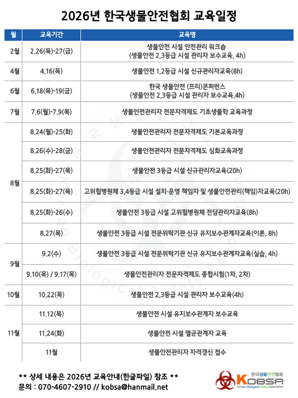 공지사항 2026년 생물안전 시설 안전관리 워크숍 안내(접수: 1.5~1.22) 2025년 한국생물안전협회 생물안전 분야 유공 포상 신청 접수 안내(~12.17) 2025년 생물안전 시설 멸균관계자 교육(11.25.) 결과 [한국보건복지인재원] 제4기 생물안전3등급보수교육_기관생물안전위원회운영및관리(11.27/비대면) 2026년 생물안전 시설 안전관리 워크숍 기업전시회 및 기업광고 안내(~1.16까지)