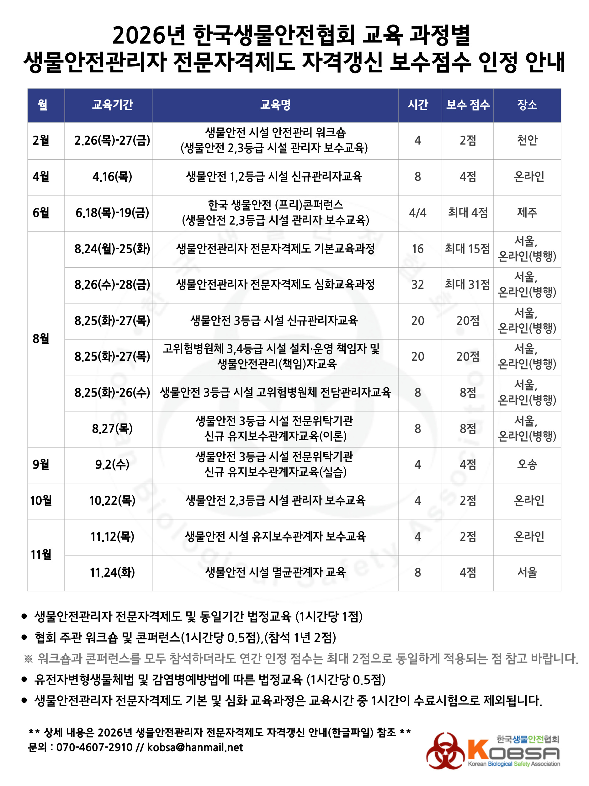 □ 2026년 한국생물안전협회 교육 과정별 생물안전관리자 전문자격제도 보수점수 인정 기준은 아래 이미지를 참고하시기 바랍니다.