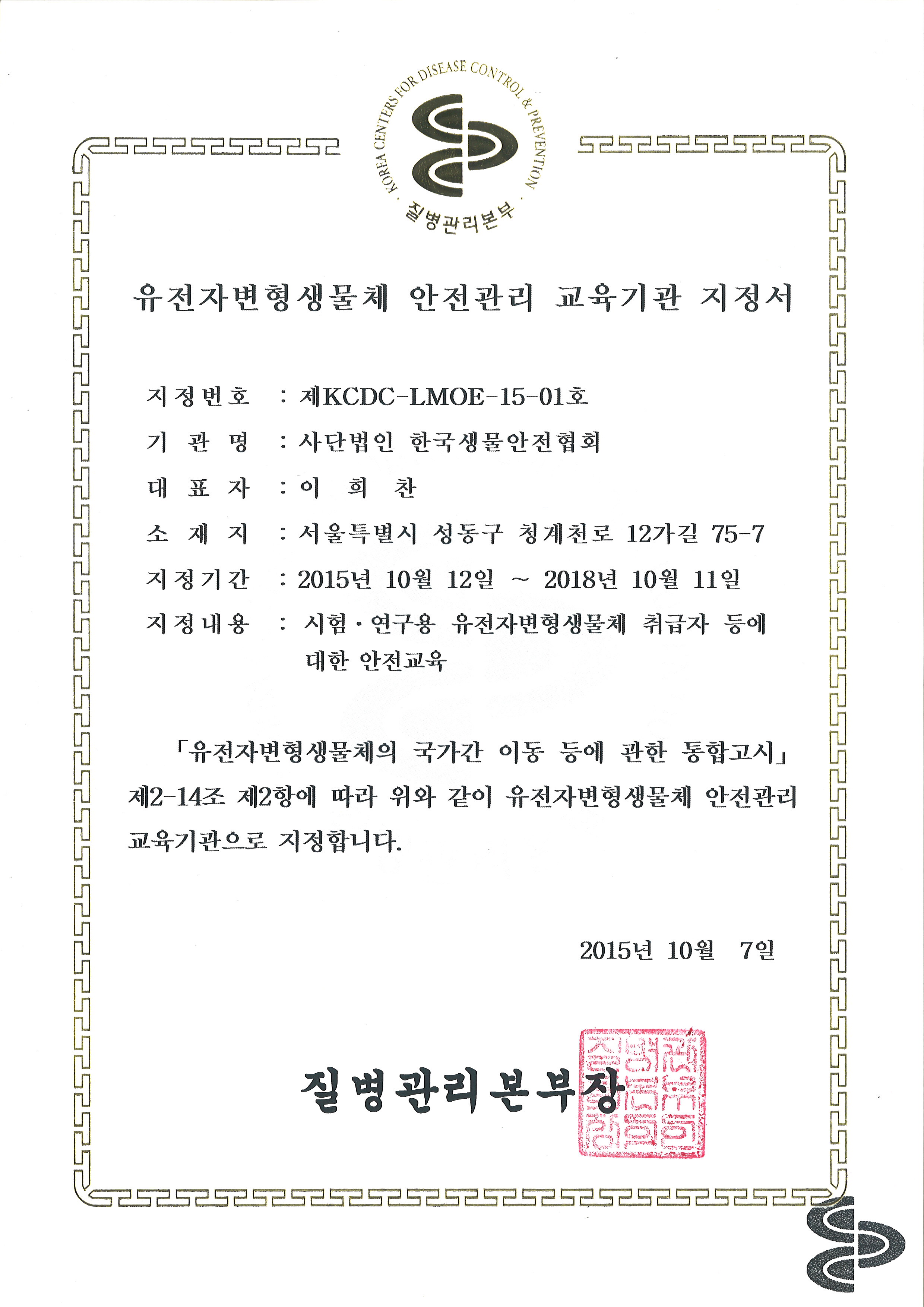 우리협회는 질병관리본부 유전자변형체 안전관리 교육기간으로