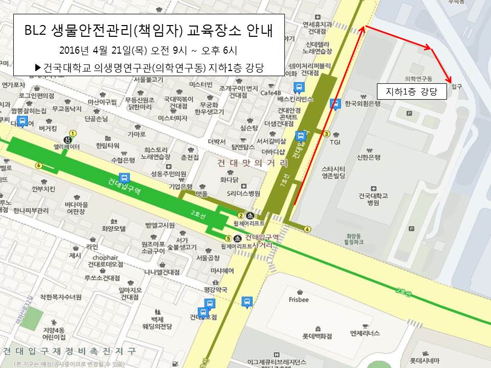 2016년 생물안전2등급연구시설 생물안전관리책임자 및 생물안전관리자 교육장소 안내입니다.