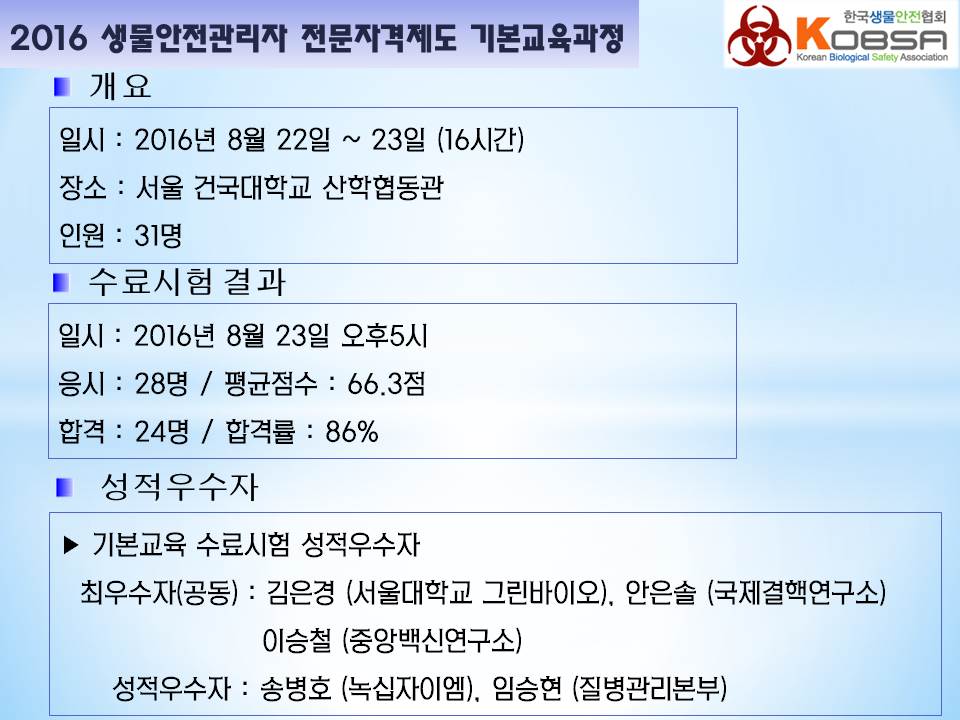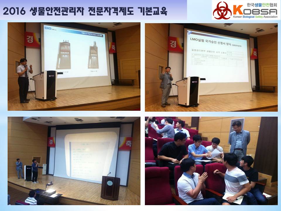 생물안전관리자전문자격제도 기본교육 보고. 작성자 KOBSA 조회 1,165 작성일 2016-08-30 안녕하세요 한국생물안전협회입니다.2016년 8월 22일 ~ 23일 서울 건국대학교에서 2016년 생물안전관리자 전문자격제도 기본교육과정과 수료시험을 진행하였습니다.수료시험 결과는 참가자 개별메일로 안내하였습니다.감사합니다. 첨부파일 슬라이드1.JPG슬라이드2.JPG슬라이드3.JPG 이전글 다음글 목록