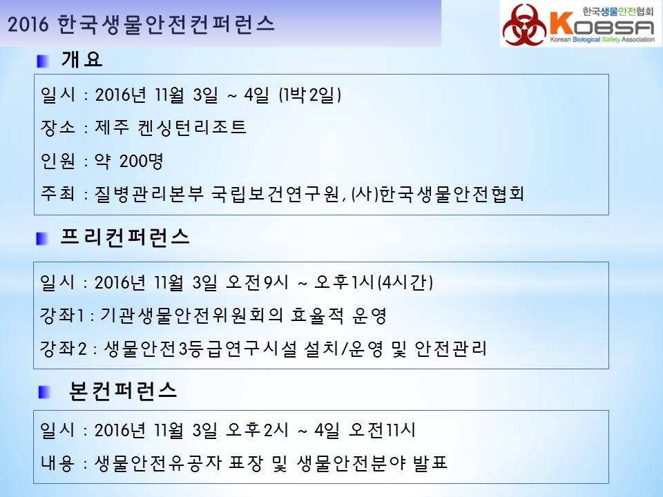 제4회 한국생물안전컨퍼런스 사진보고(11.3-4) 작성자 KOBSA 조회 1,209 작성일 2016-11-23 2016년 11월 3일~4일 제주도 켄싱턴리조트에서 진행한 제4회 한국생물안전컨퍼런스는 국내 생물안전연구시설 연구자, 전문가들의 많은 참석으로 성황리에서 진행하였습니다.감사합니다. 첨부파일 슬라이드1.JPG슬라이드2.JPG슬라이드3.JPG슬라이드4.JPG슬라이드5.JPG슬라이드6.JPG슬라이드7.JPG 이전글 다음글 목록