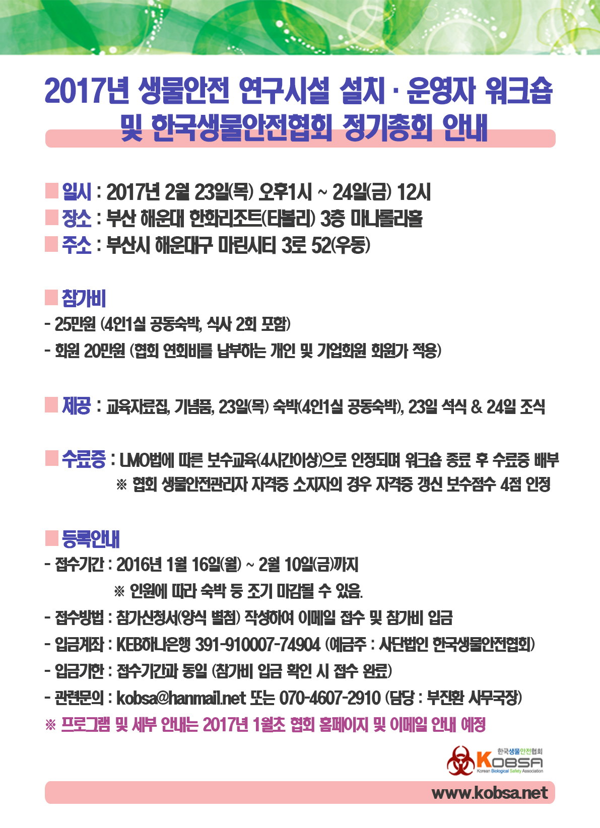 2017년 생물안전연구시설 설치,운영자워크숍 안내(접수마감)