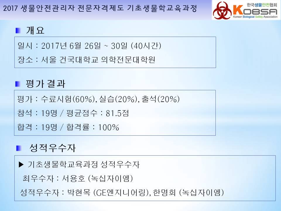 2017년 생물안전관리자 전문자격제도 기초생물학교육과정 보고입니다.