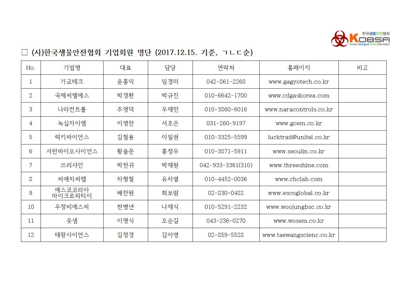 기업회원사 명단(2017.12.15 기준) 작성자 최고관리자 조회 1,584 작성일 2017-12-15 안녕하세요 한국생물안전협회입니다. 협회 기업회원사 명단을 안내합니다. 생물안전시설 설계,시공,유지관리,장비,멸균 등 다양 분야의 전문기업이 함께하고 있습니다. 첨부파일 2017.12.15 기업회원명단.pdf 이전글 다음글 목록