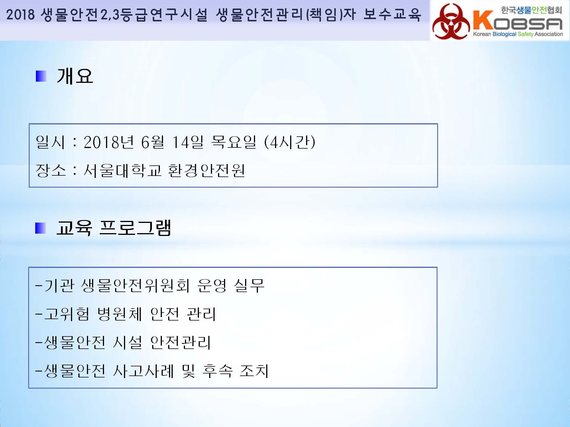 2018년 생물안전 2,3등급 연구시설 생물안전관리(책임)자 보수교육을 서울대학교 환경안전원에서 다음과 같이 진행하였습니다.