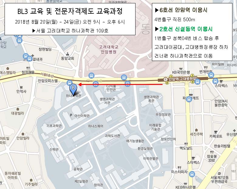 8월 20일~24일 서울 고려대학교 진행하는 생물안전관리자 전문자격제도 및 BL3 관계자 교육과정에 대한 장소안내입니다.