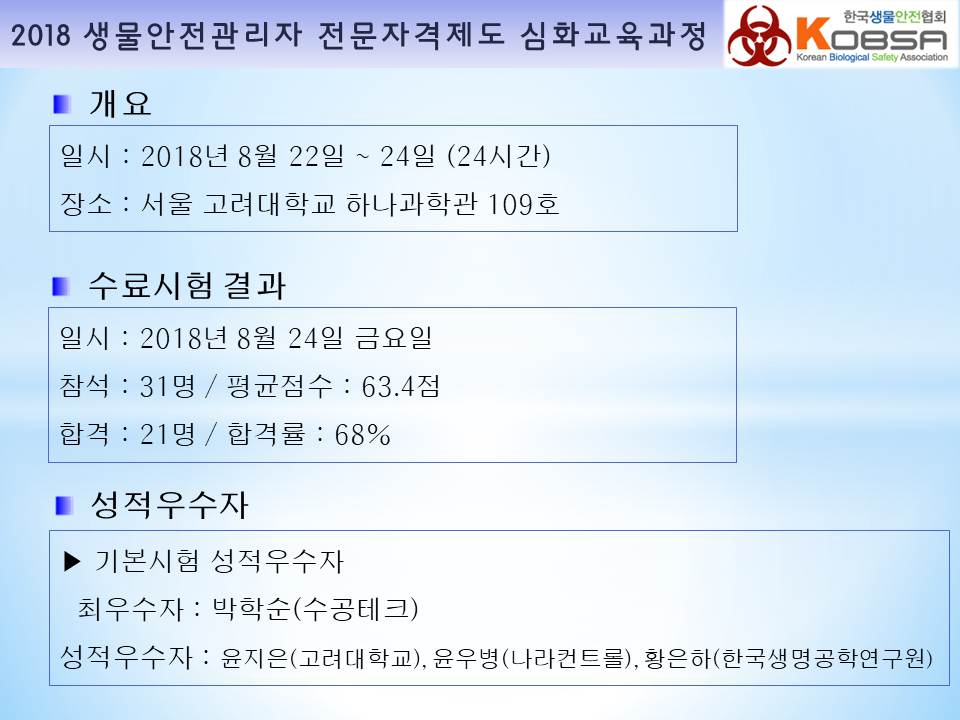 2018년 생물안전관리자 전문자격제도 심화교육과정을 서울 고려대학교 하나과학관에서 다음과 같이 진행하였습니다.