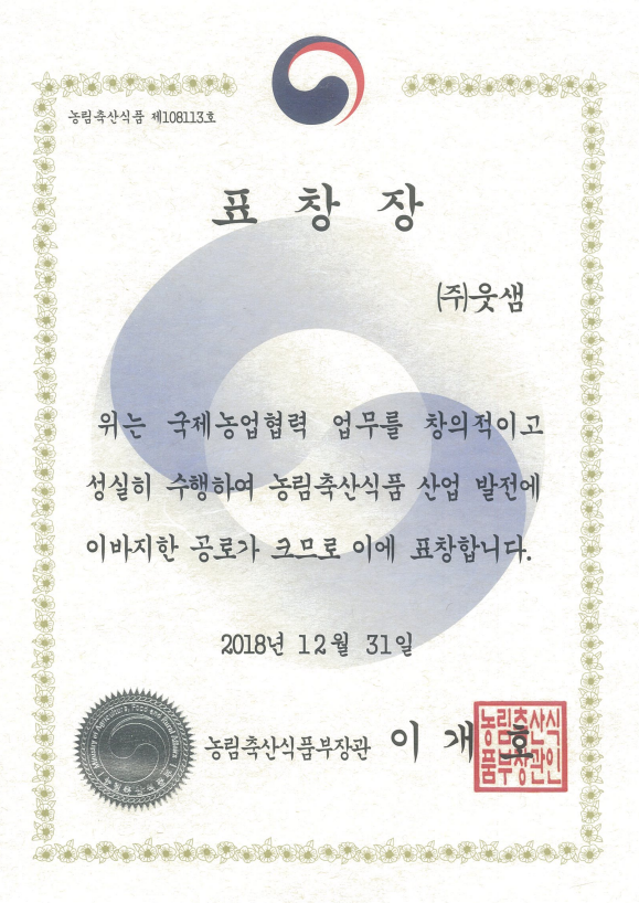 [홍보](주)웃샘 농림축산식품부장관 표창