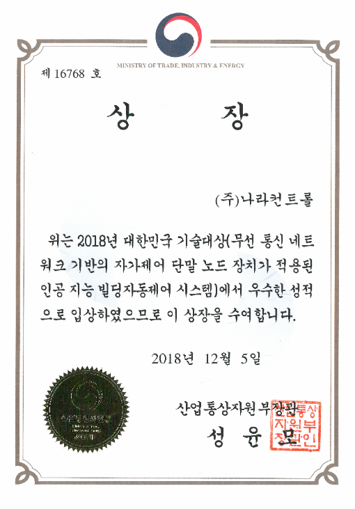 [홍보](주)나라컨트롤 2018년 기술대상 장관상 표창